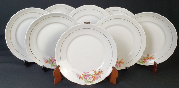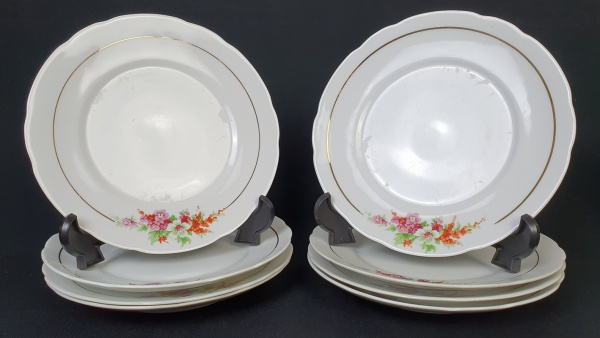 • Real - Oito pratos rasos em porcelana real esmaltadas com flores em policromia e friso dourado. Medindo: 23 cm.