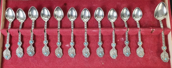 • PRATA - Caixa da Galeria das Pratas com 11 colheres de café e 1 colher de açúcar em prata contrastada, teor 925. com pedra turquesa.