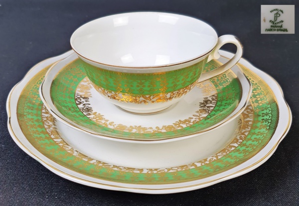 • Steatita, Paraná  - Xícara para chá com pires e prato de bolo, confeccionado em porcelana nas cores verde e branco, com rica policromia e douração.