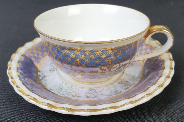 • Steatita, Paraná  - Xícara para chá com pires nas cores azul e lilás com rica policromia e douração.