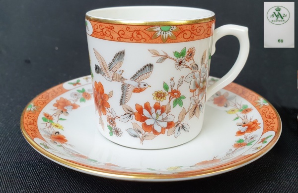 • VISTA ALEGRE - Xícara de café em porcelana portuguesa, período 1992-1997 ,decorado em rouge-de-fer e ouro com motivos de pássaros e flores. Em perfeito estado.