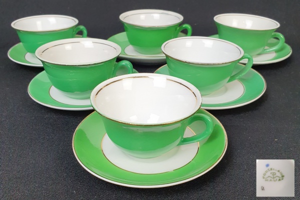 • Mauá - Conjunto de seis xícaras para café em fina porcelana, na cor verde e fios de ouro. Uma com fio de cabelo.