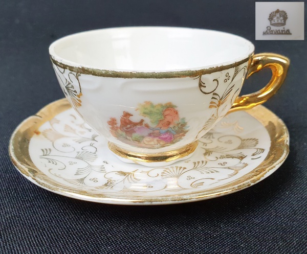 • Bavaria - Xícara para café em porcelana, com rica douração e cena galante ao centro.