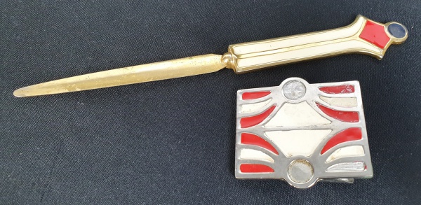 • Abridor de cartas e prendedor em metal dourado, cinzelado. Medindo: 23 cm e 6,5 x 6 cm.