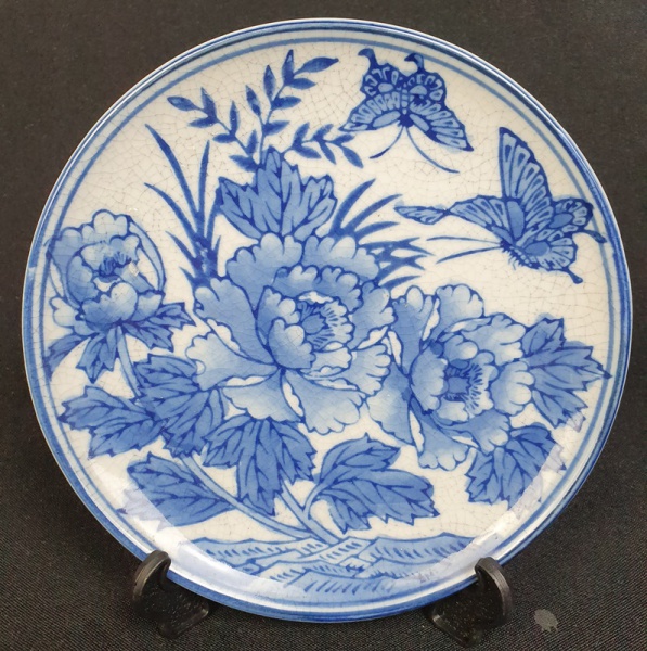 • Prato em porcelana chinesa, esmaltado com flores e borboletas em azul, sobre fundo branco. Medindo: 15 cm