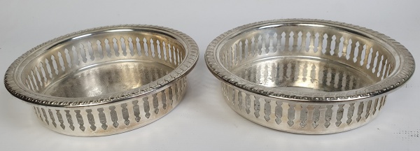 • Dois porta garrafas em metal espessurado à prata, bordas vazadas. Medindo: 4 x 14 cm.