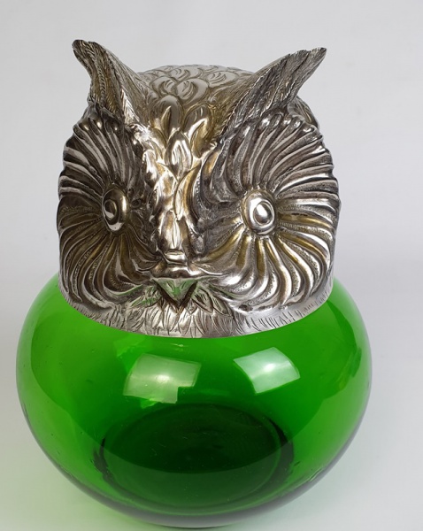 • Biscoiteira em vidro verde, com tampa em metal espessurado à prata, cinzelado, no feitio de coruja. Medindo: 21 x 18 cm