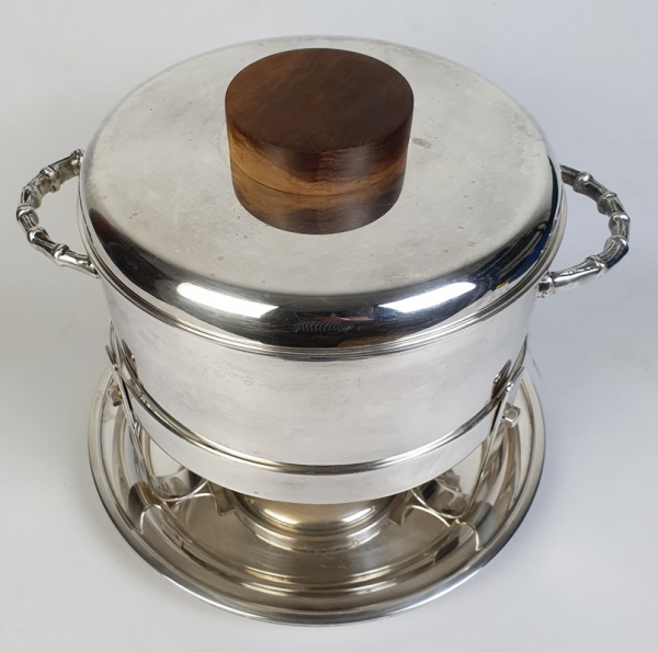 • St. James - Rechaud redondo em metal espessurado à prata, com pega em madeira. Medindo: 22 x 27 cm.