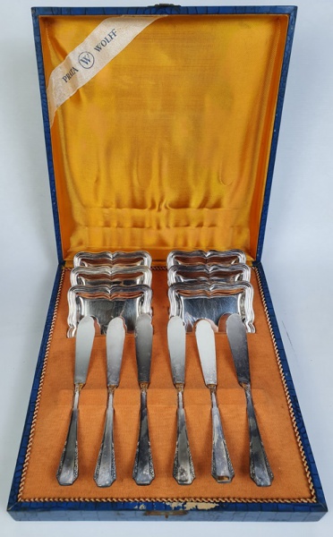 • Conjunto para servir em estojo original, composto de seis porta manteigas com 6 espátulas.