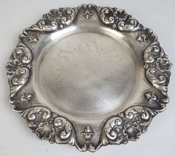 • Salva em metal espessurado à prata, com bordas ricamente cinzeladas e pés tripóides. Medindo:
