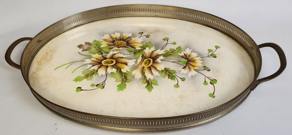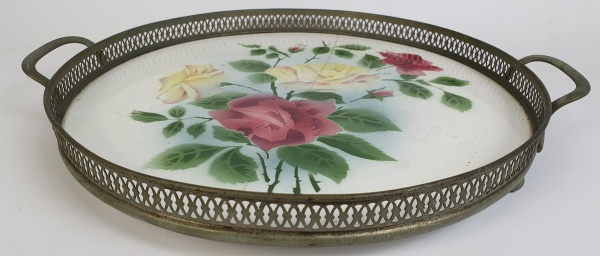 • Bandeja de coleção em faiança europeia, com galeria em metal vazada. Medindo:43 x 27 cm. Apresenta fio de cabelo.