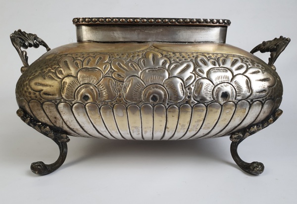• Floreira em metal prateado, ricamente cinzelada, alças laterais e 4 pés. Medindo: 15 x 42 cm.