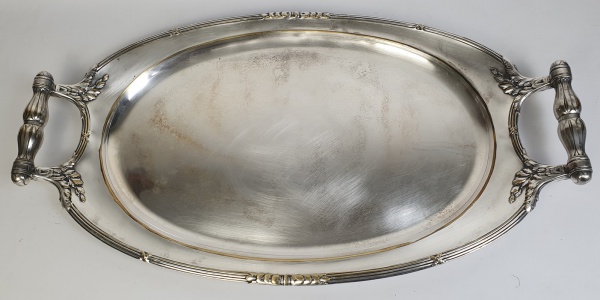 • Imponente bandeja em metal espessurado à prata, com alças e laterais cinzeladas. Medindo: 95 x 41 cm.