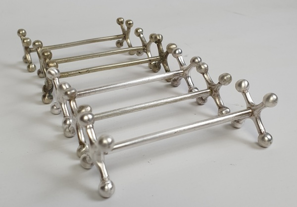 • Seis descansos para talhares em metal espessurado à prata. Apresenta desgastes