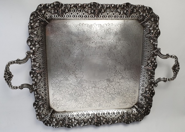 • Belíssima bandeja em metal espessurado à prata, ricamente cinzelada. Medindo: 44 x 33 cm.