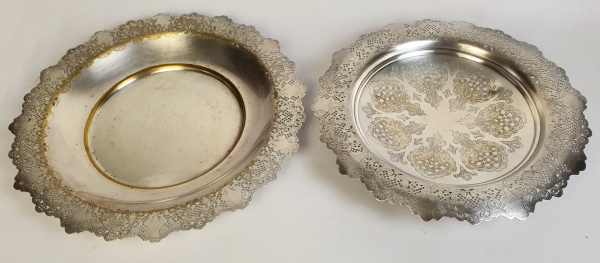 • Meridional - Duas cestas em metal espessurado a prata, filigranada. Medindo: 25 cm e 29 cm. Apresenta desgaste.
