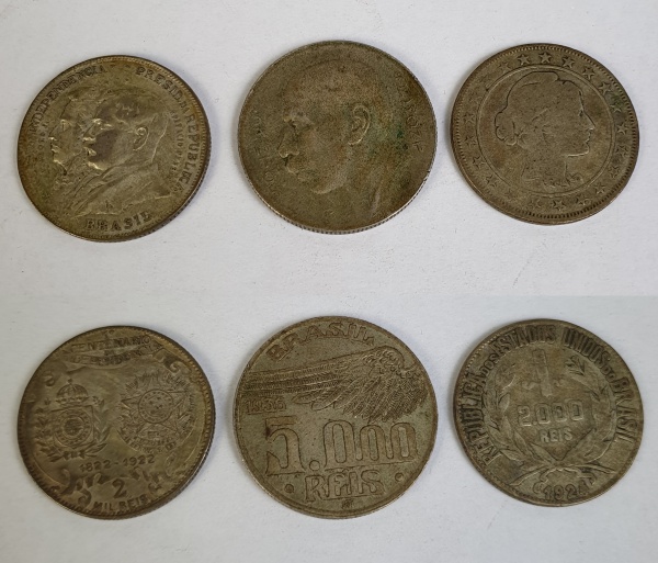 • Numismática, Brasil -  3 (Três) moedas, sendo uma de 5000 réis 1936, duas de 2000 réis de 1924 e uma do Centenário da Independência.