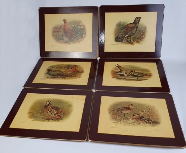 • Seis jogos americanos, em laca com decoração de aves. No estojo. Medindo: 29 x 24 cm.