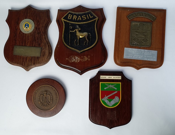 • Militaria  - Cinco Placas / Escudos em madeira,  pertencentes ao General do Exercito Brasileiro, Carlos Tinoco Ribeiro Gomes (1928 - 2018).  Medindo menor; 11 cm e maior: 20x15cm.