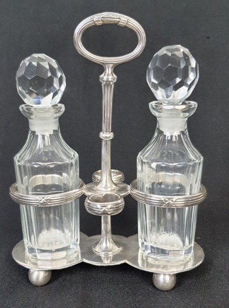 • Wolff - Galheteiro em metal espessurado a prata. Medindo: 16 cm, 10 x 15 x 22,5 cm. Recipiente de vidro apresenta fungos e 1 bicado.