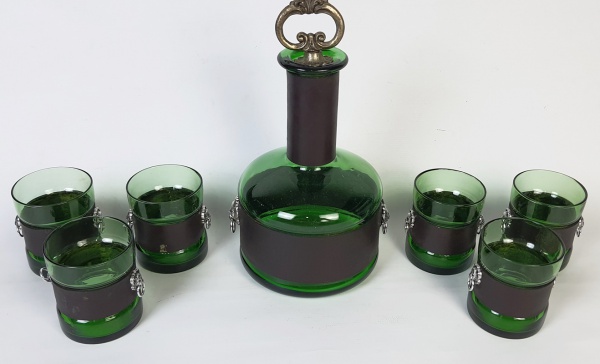 • Rústico conjunto para bebidas destiladas composto de garrafa em vidro verde circundado por tira de couro com dois medalhões cara de leão e pega em metal envelhecido com 06 copos do mesmo padrão. Medindo: 26 x 13 cm e 8 x 6 cm.