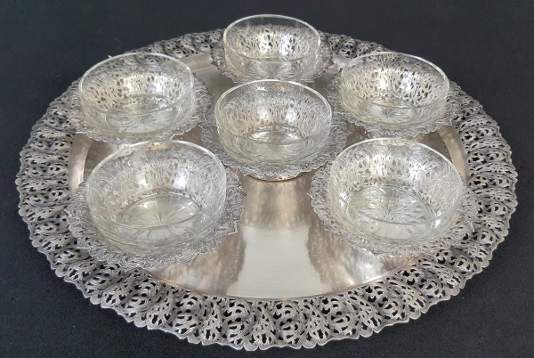 • Meridional - Antigo conjunto para sobremesa em vidro, com lapidação estrelar, bandeja e suportes filigranados e ricamente cinzelados. Década de 50. Medindo: 9 x 4 cm, 3 x 12 cm e 2,5 x 39 cm.