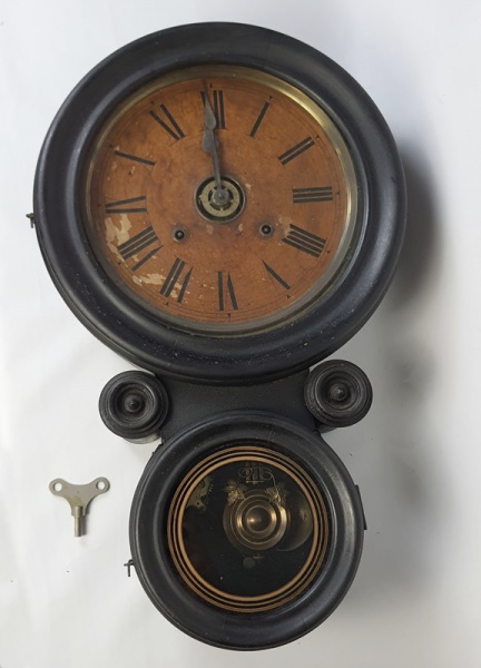 • ANSONIA. Relógio de parede modelo oito. Em madeira. Com chave. Origem Estados  Unidos. Necessita revisão. Medindo:: 46 x 35 x 11 cm.