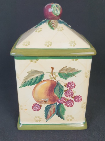 • Biscoiteira em cerâmica pintada a mão pela artista plástica americana Tracy Porter em bege com policromia de frutas. Tampa com  pressão. Medindo: 25 x 14 x 14 cm.