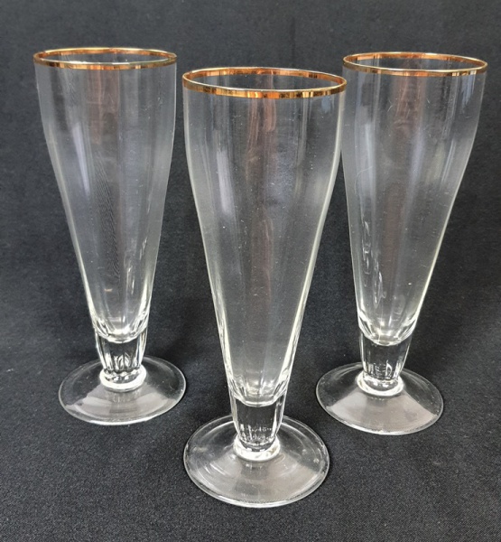 • Três tulipas de cristal para cerveja com bordas filetadas a ouro e corpo com efeito canelado. Medindo: 20 x 6 cm.