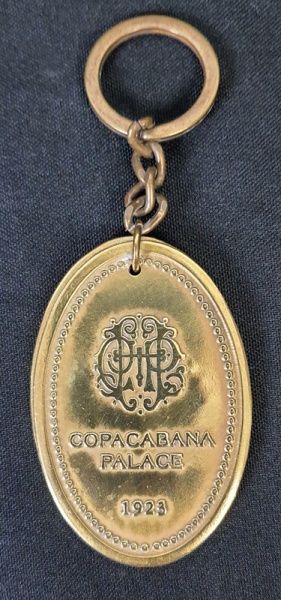 • Chaveiro em bronze do hotel COPACABANA PALACE, verso com o nome do cantor americano RAY CHARLES e o número da  suíte em ocasião da visita do astro ao Rio de Janeiro. Medindo: 7 cm.