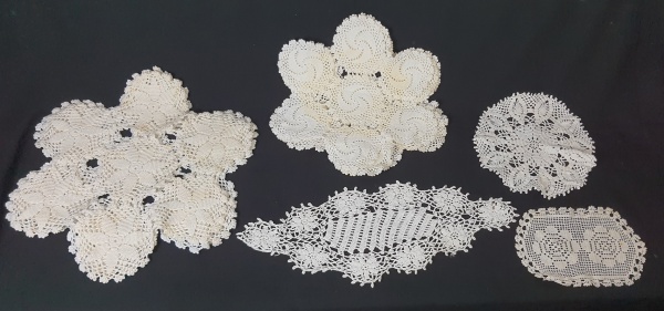 • Onze paninhos de mesa trabalhados em crochê na cor branca. Medindo: 22 x 14 cm a 40 x 37 cm. Apresenta manchas.