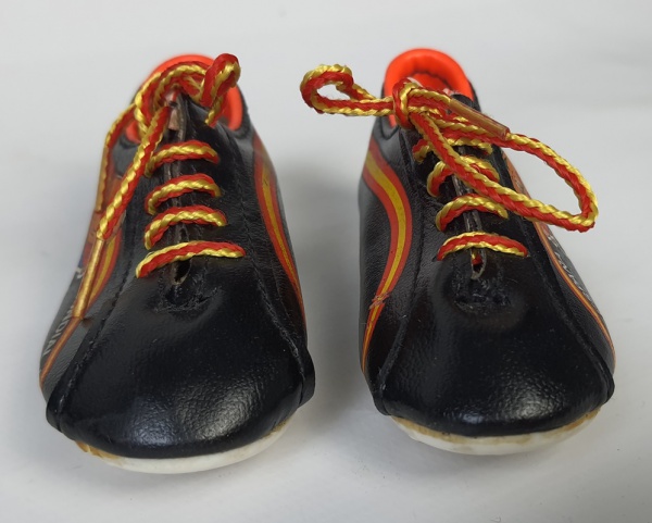 • Par de mini chuteiras Monely R  Zel Chik’s L, comemorativa à Copa do Mundo 1982, na Espanha. Em couro, com o mascote Naranjito. Medindo: 11 cm. Sola descolando.