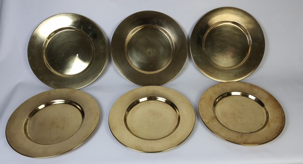• Seis sousplats noruegueses,  em metal dourado  com selo da loja Colseth em  Oslo/Noruega. Medindo: 29 cm.