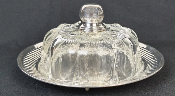 • Queijeira em cristal  com lapidação dedão com contornos frestados e  bandeja banhada a prata. Medindo: 12 x 28 cm.