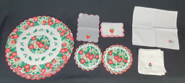 • Seis jogos americanos  com estampa de morangos, flores e folhas com seis guardanapos da mesma padronagem. Medindo: 36 cm, 16 cm, 18 x 13 cm  e 28 cm. Apresenta manchas.