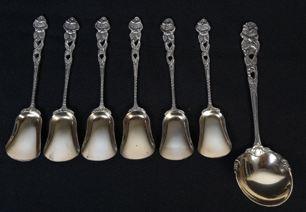 • Sete colheres de sobremesa, cabo espessurados a prata e concha em vermeil. Medindo: 12 e 16 cm.