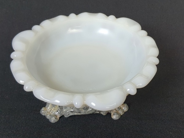 • Saboneteira redonda em opalina branca com bordas trabalhadas encimada em base de metal ricamente cinzelada adornada com volutas e acalantos. Medindo: 6 x 13 cm.