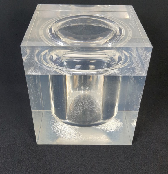 • Grande e pesada geleira com tampa moldada em grosso bloco de acrílico, base com efeito de gelo condensado e interior na forma esférica. Anos 70. Medindo: 20 x 18 x 18 cm.