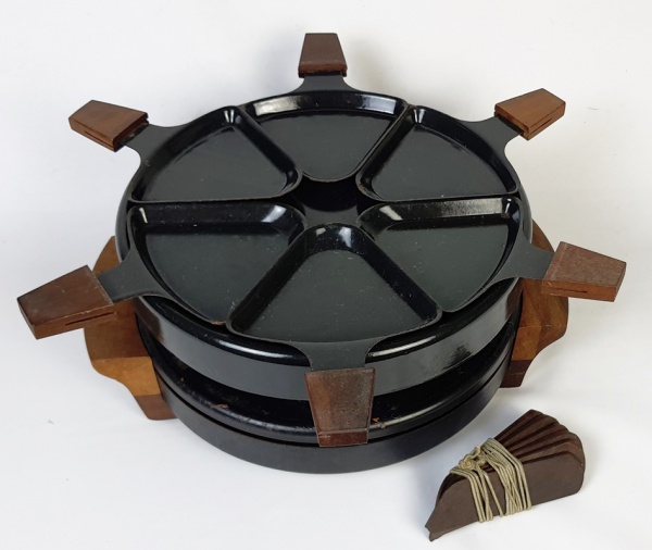 • Racleteira elétrica Tropi-Art para 6 pessoas. Possui marcas de oxidação 110 volts. Medindo: 20 x 35 x 40 cm. Funcionamento desconhecido.