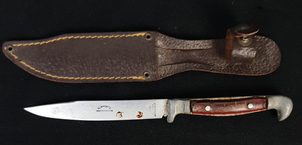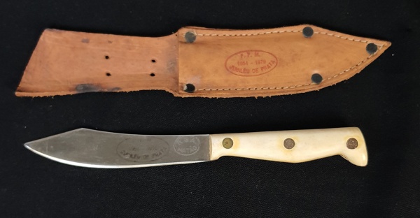 • Faca em aço, com bainha de couro, jubileu de prata (1954 -1979). Medindo: 20 cm.