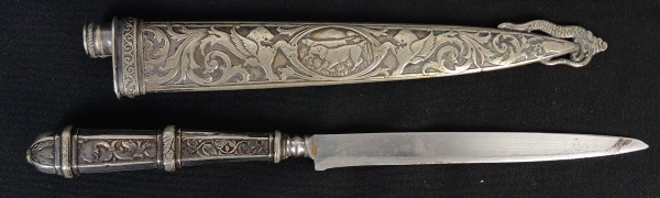 • Faca gaúcha em metal espessurado à prata, com cabo e bainha cinzelados. Medindo: 35 cm. Apresenta desgastes.