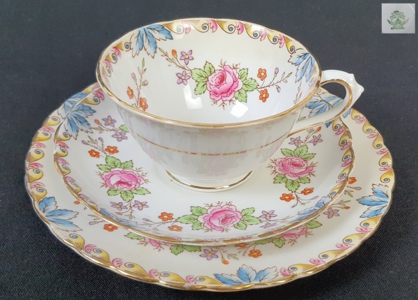 • Tuscan - Trio para chá em porcelana inglesa, com decoração floral e fios de ouro. Xícara apresenta discreto fio de cabelo.