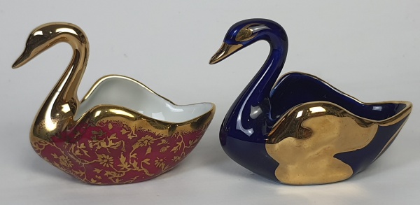 • Limoges, Miniatura - Dois bibelôs em porcelana francesa, representando cisnes. Medindo: 5,5 x 7 cm.