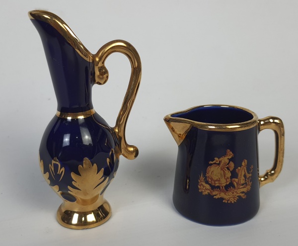 • Limoges, Miniatura - Jarra e leiteira em porcelana francesa na cor azul cobalto com rica douração. Medindo: 5 cm e 10 cm.