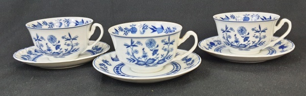 • Steatita - Três xícaras para chá em porcelana branca no padrão "Blue & White", dito "Cebolinha", borda do pires movimentada, em relevos, com friso azul, marcados ao fundo.