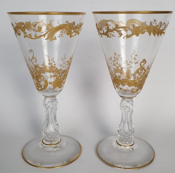 • SAINT LOUIS - Belíssimo par de taças em cristal francês ricamente decoradas com ouro em alto relevo e haste trabalhada. Medindo: 14 x 7 cm.
