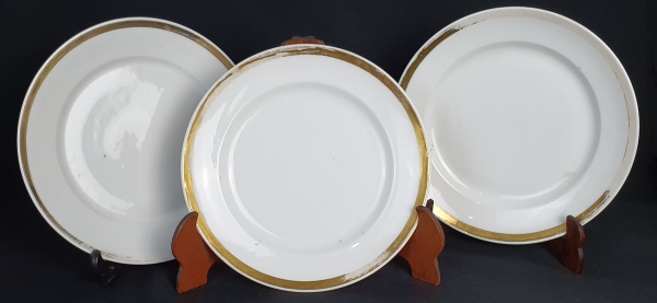 • Três pratos em porcelana na cor branca com bordas em ouro. Medindo 24 cm. Apresenta desgastes na douração.