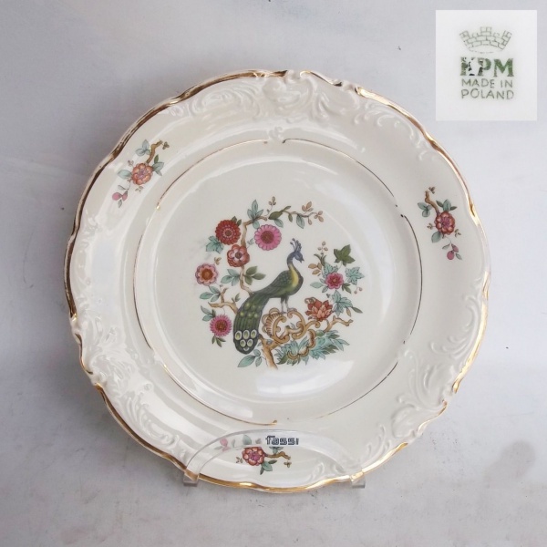 • KPM - Prato decorativo em porcelana com delicada decoração flora le pavão ao centro, bordas fileta a ouro. Medindo: 27 cm.