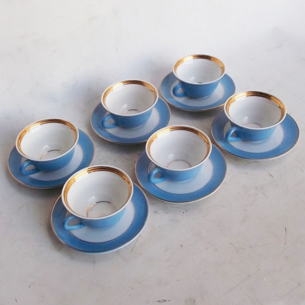 • Mauá - Seis xícaras para café em porcelana, esmaltado na cor azul com fio de ouro.
