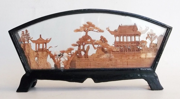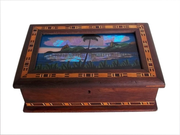 • Caixa antiga marchetada  com vidro e asa de borboleta, representando Rio de Janeiro. Medindo: 28 x 1 8 x 8 cm.